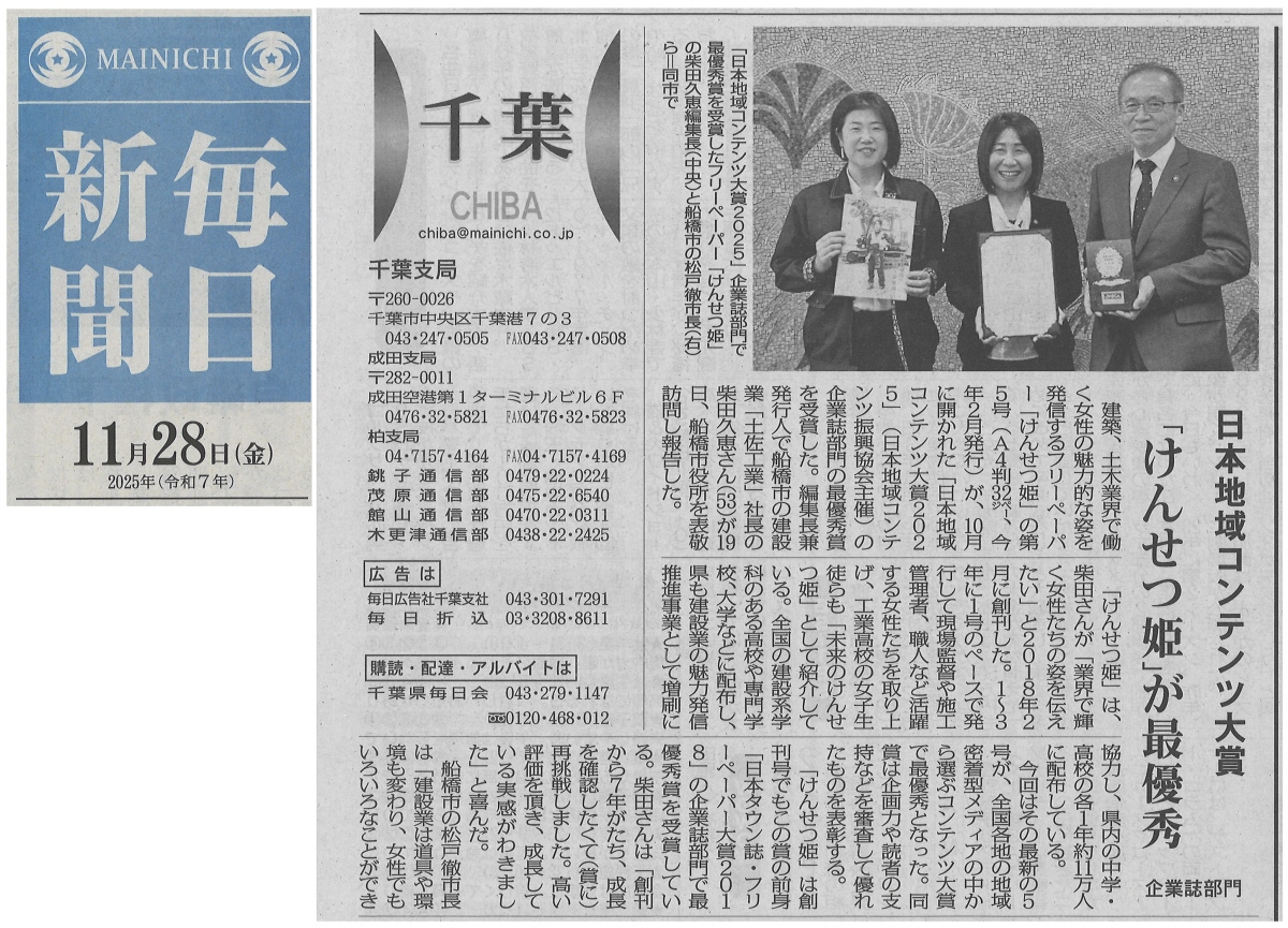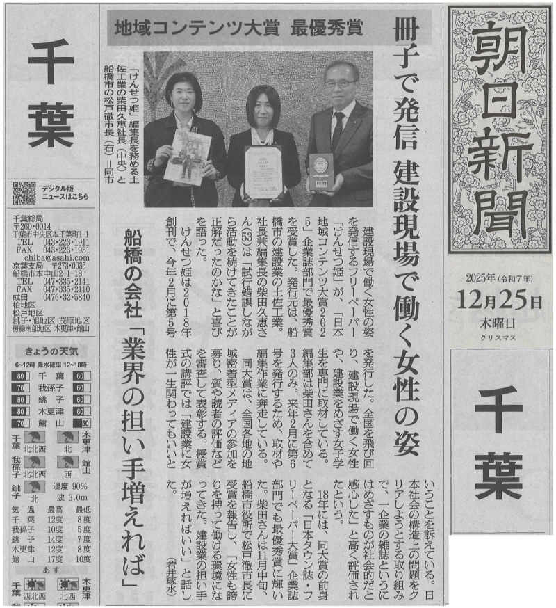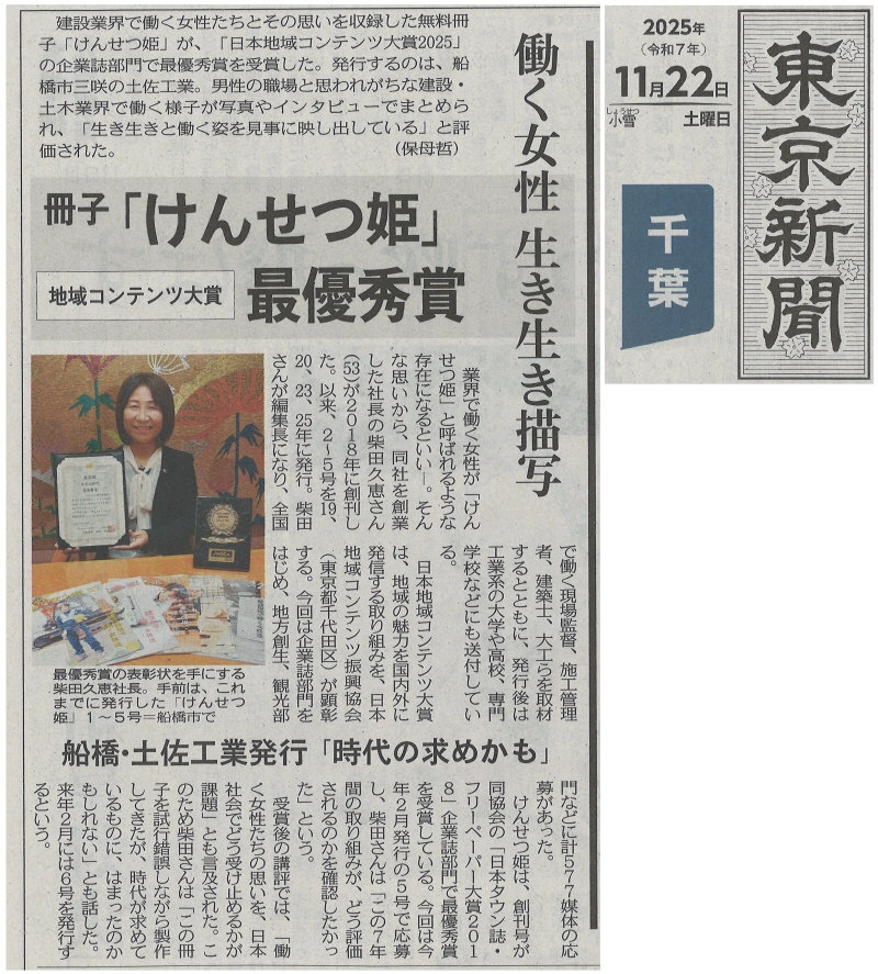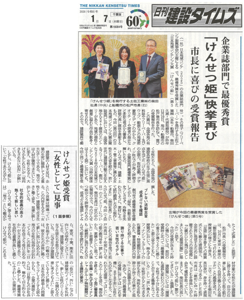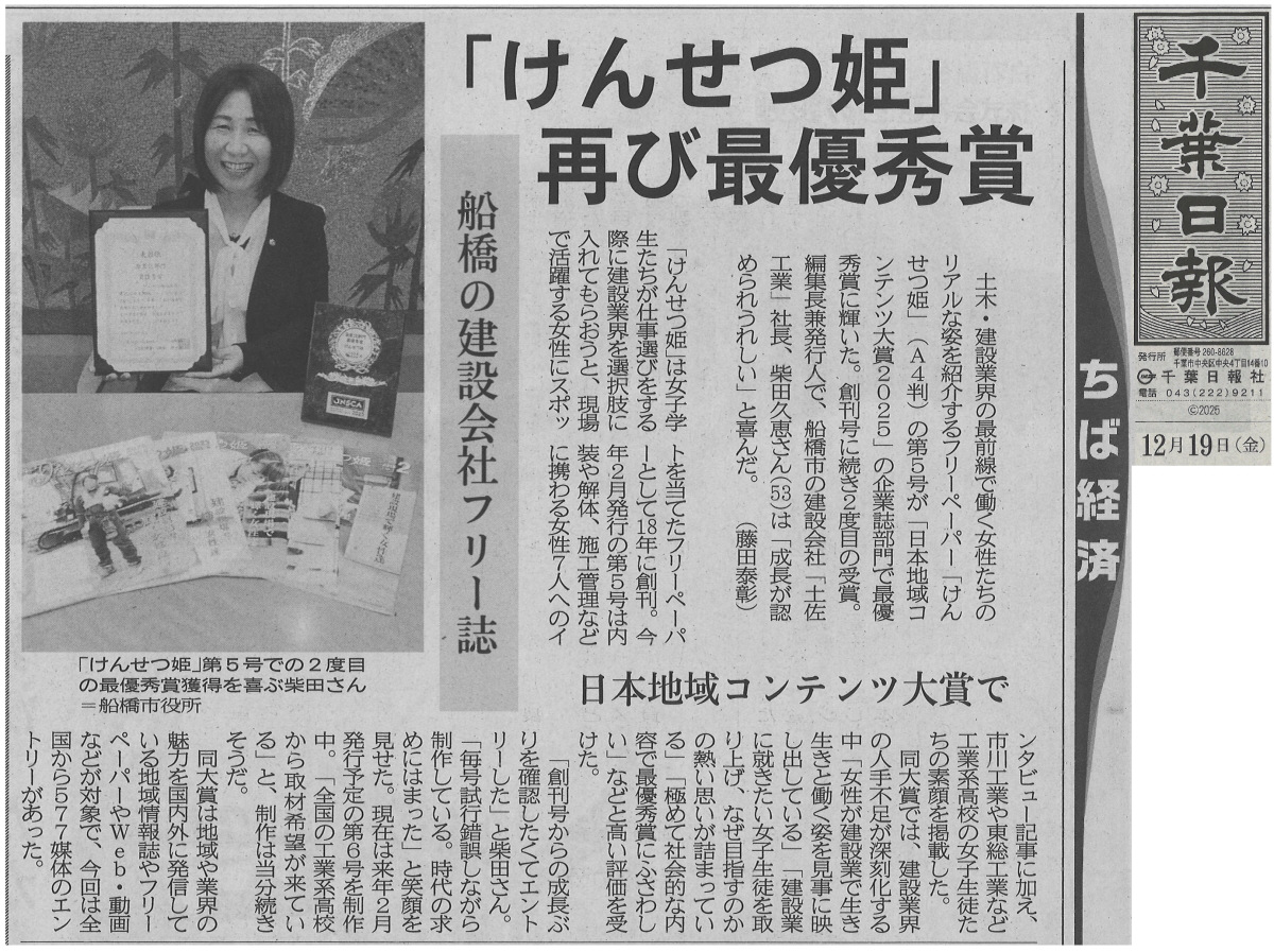 この度、弊社が発刊しているフリーペーパー「けんせつ姫」が、日本地域コンテンツ大賞2025において「企業誌部門 最優秀賞」を受賞いたしました。