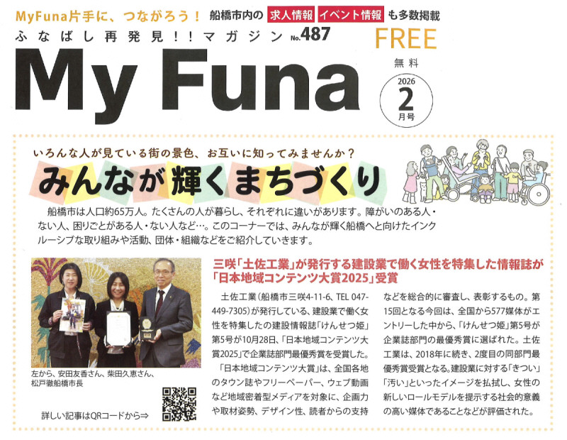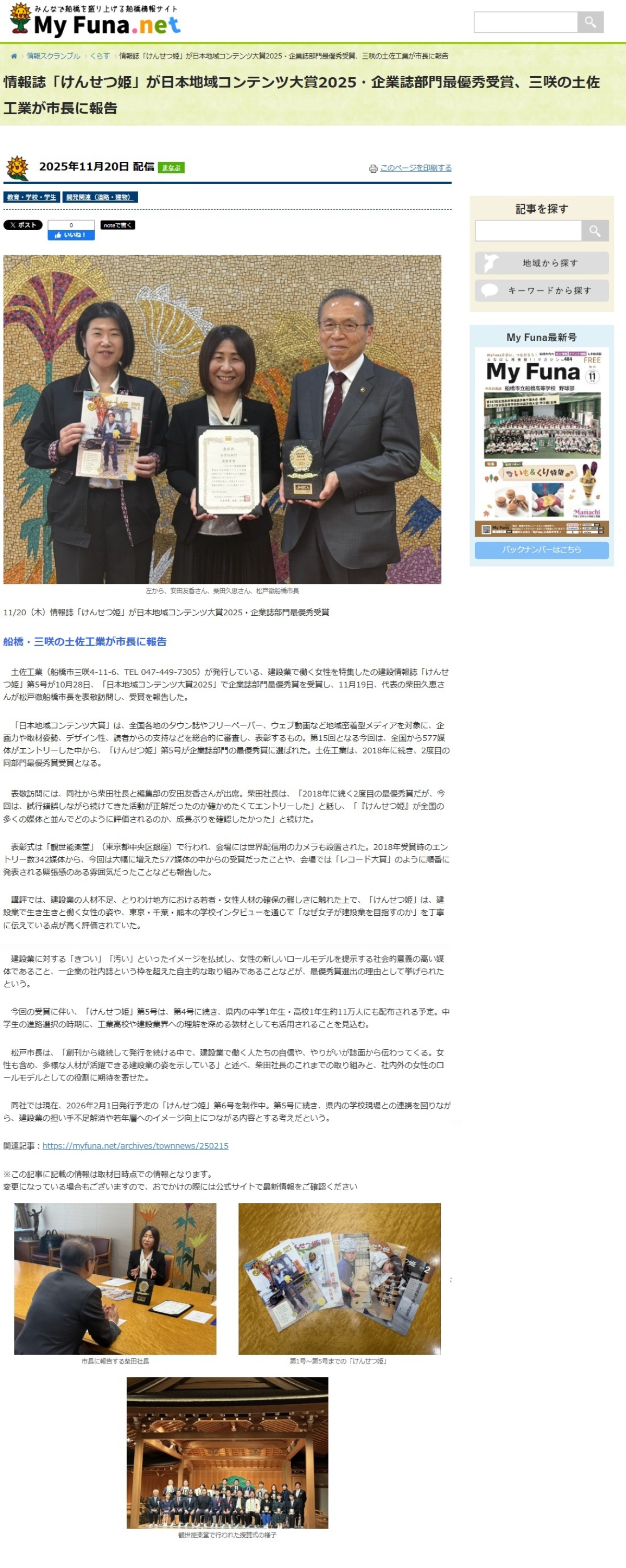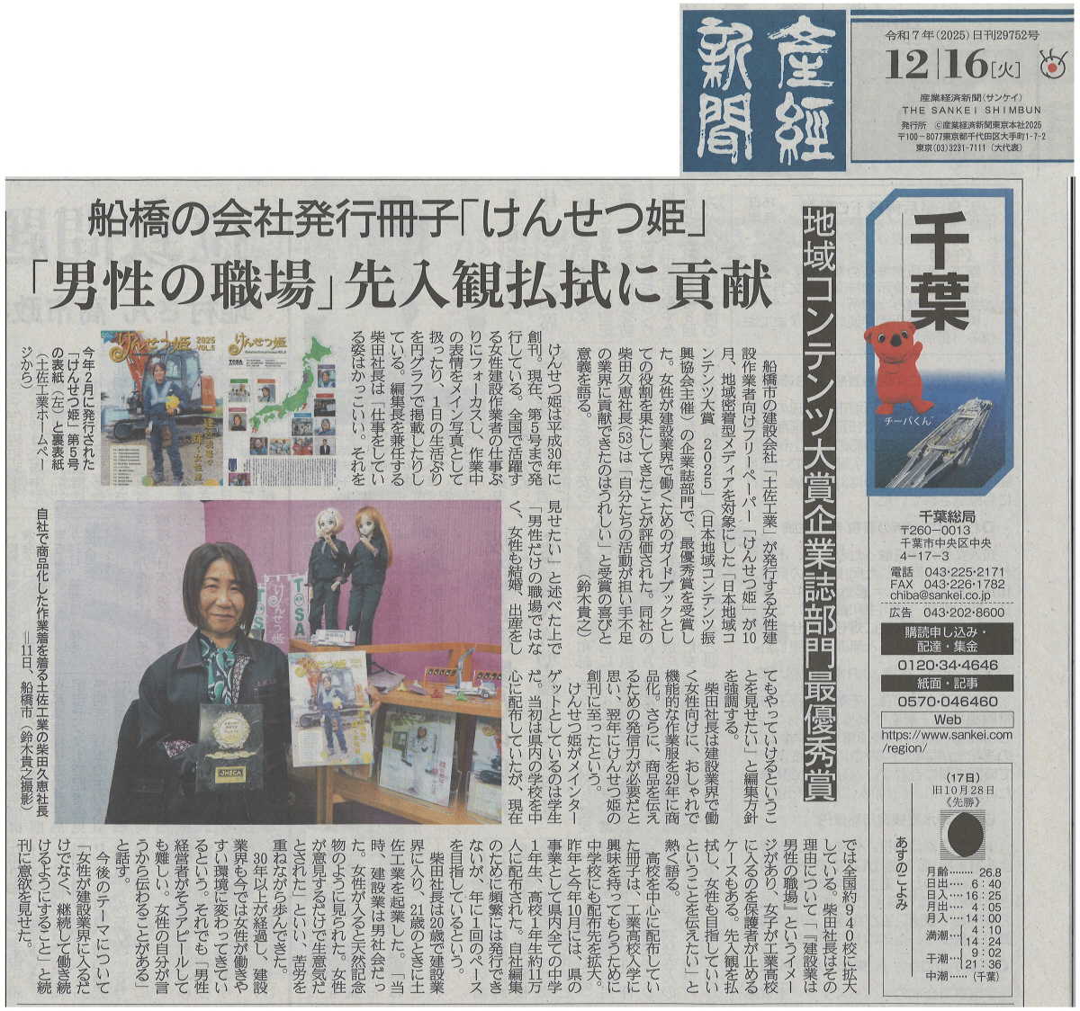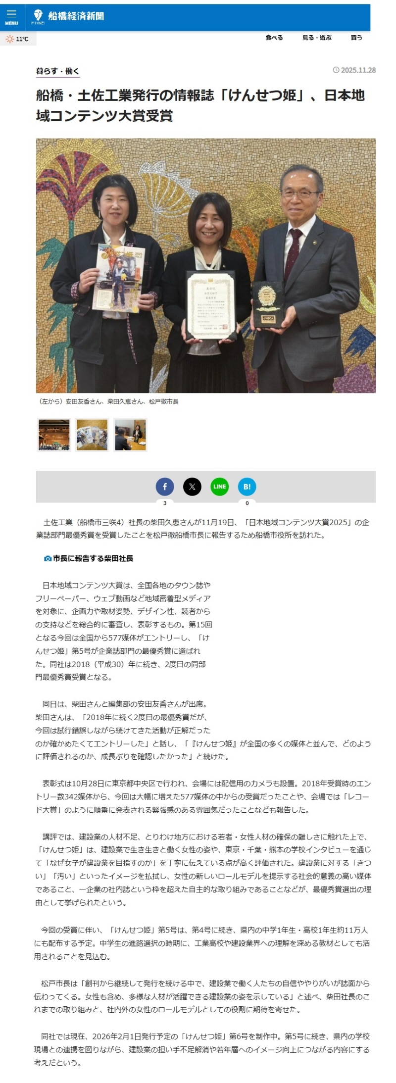 この度、弊社が発刊しているフリーペーパー「けんせつ姫」が、日本地域コンテンツ大賞2025において「企業誌部門 最優秀賞」を受賞いたしました。